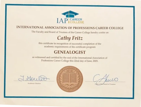 Hello! My name is Cathy Fritz, and I have an MBA in Technology Management. I am also a certified Genealogist, and I am passionate about all things genealogy!